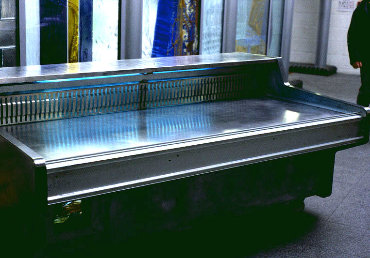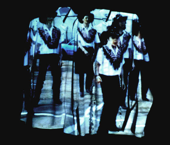 Line dancers projected onto shirts hanging on stage in the auditorium. Viewed from gallery with country music filling the space loudly. Butchers cabinet plays piano recital every 15 minutes. Tiny video image shows hands on keyboard. |