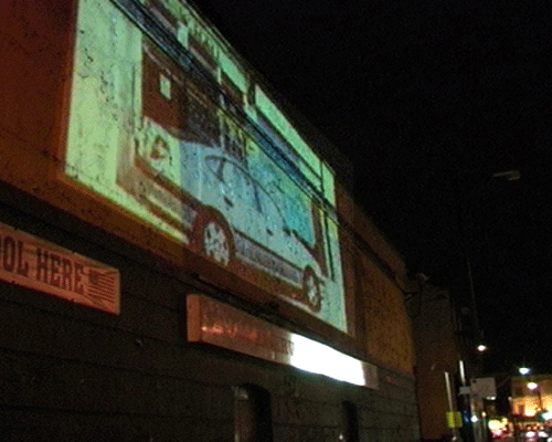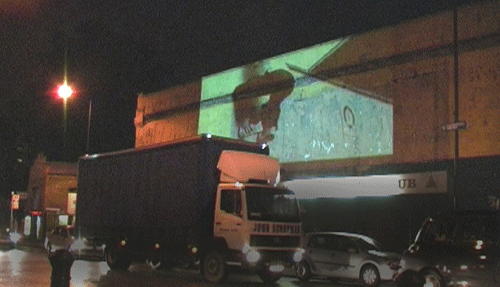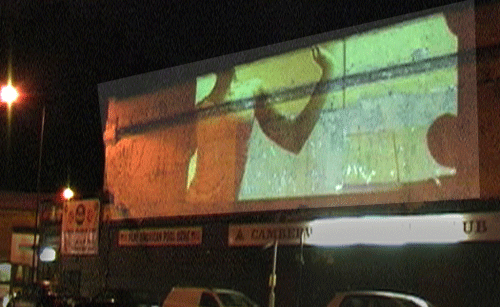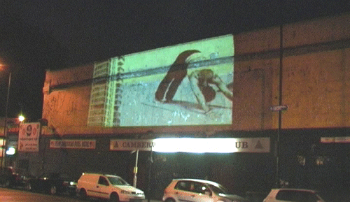On the Camberwell New Road this projection was onto the 24 hour Snooker Hall. Projected from the training rooms of the bus depot light shone across the busy road. Viewers were able to watch from the busy street and bus stops aS the images ran through the night. The Whyndam estate close by featured in much of the imagery.