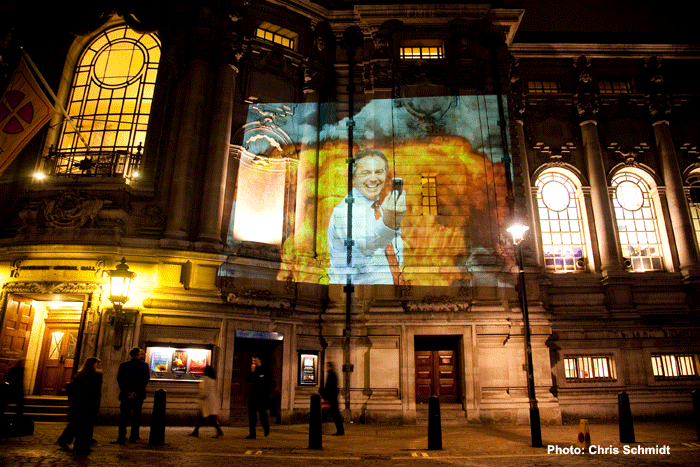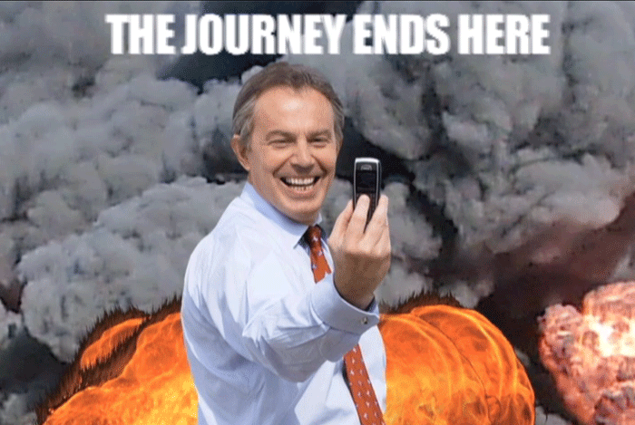 behind Blair with scrolling text 'The Journey ends here' referring to