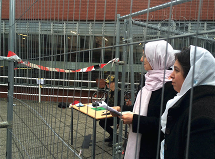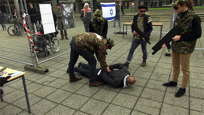 Sedgewick site in February, 2016. Artists, activists and students worked together and individuals had passes, or uniforms, back-stories and planned journeys that took them beyond the checkpoint. Some were going to work, visit sick relatives in hospital or to study. This installation began a weeklong series of activities to mark Israeli Apartheid Week and was developed with the University Palestine Society and Cambridge University students, Julia Modern and Oblique Arts. |