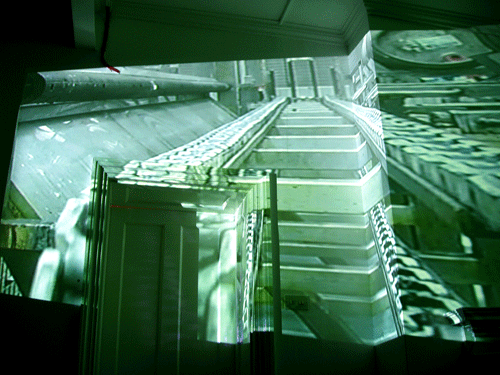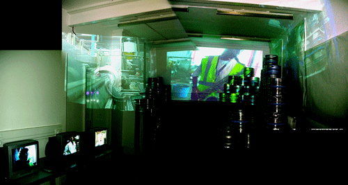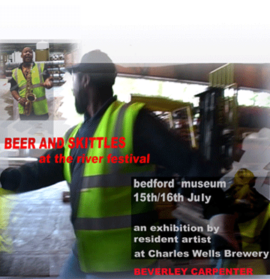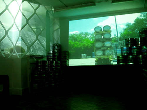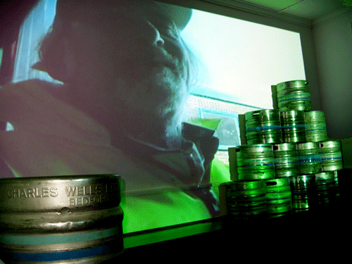 This lively exhibition offered multi screen projections that placed the working environment alongside the individuals who work there. Real kegs were stacked against the gallery walls. Two walls offered projected footage of the machinery operating within the keg and cask department and the bottling and canning lines. Juxtaposed on another wall the members of the workers were shown at various frames per second. They are captured in moments of abandon, taken 'outside' of themselves through unexpected engagement with arts and music on the shop floor.