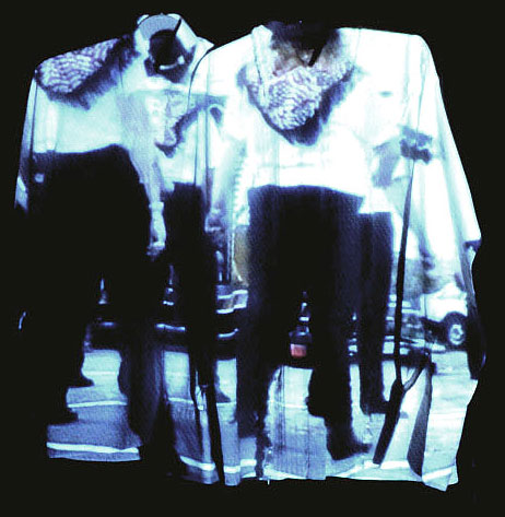 Line dancers projected onto shirts hanging on stage in the auditorium. Viewed from gallery with country music filling the space loudly. Butchers cabinet plays piano recital every 15 minutes. Tiny video image shows hands on keyboard. |